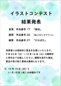 イラストコンテスト結果発表‼ 2025年9月21日 最終更新日時 : 2025年9月21日 youplakanri こんにちは、ユースプラザKOBE・WESTです。 運営ボランティア主催のイラストコンテストの審査が行われ、金賞・銀賞・銅賞が決定しました! 受賞した方は受付までお越しください! おめでとうございます!! 【金賞』 【銀賞】 【銅賞】 FacebookXBluesky