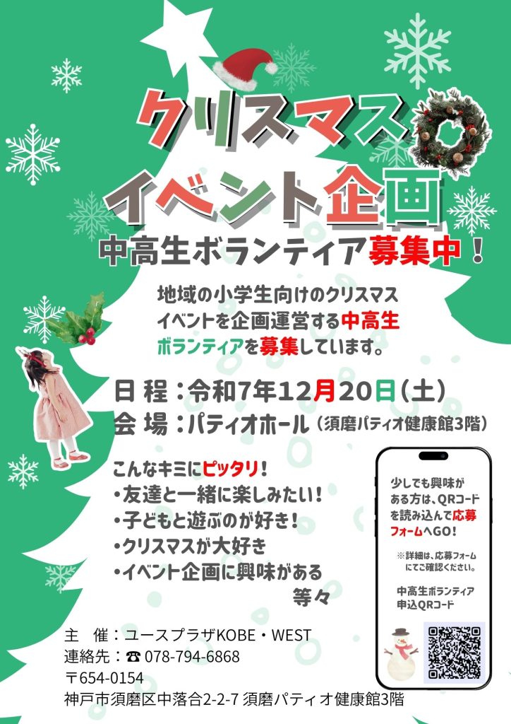 今年のクリスマスは、キミが主役!🎉小学生がワクワクするようなクリスマスイベントを企画しませんか? ゲーム、飾り付け、プレゼント…🎁アイデアを出し合って、最高の思い出を作りましょう!会議は会場と同じフロアーのユースプラザKOBE・WEST内で実施します。