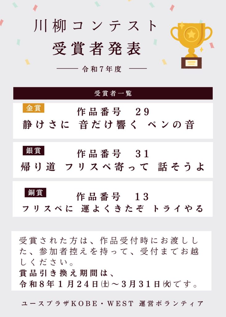 R8川柳結果発表!! 2026年1月24日 最終更新日時 : 2026年1月22日 youplakanri こんにちはユースプラザKOBE・WEST です。 運営ボランティア主催【川柳コンテスト】の審査が行われ、金賞、銀賞、銅賞が決定しました! 受賞された方、おめでとうございます。 それ以外の方もとても良い作品が多かったです!また次回チャレンジしてみてください! 受賞した方は、1月24日~3月31日の期間に受付までお越しください。 FacebookXBluesky